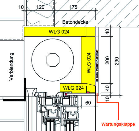 Bei einer Hebe-Schiebetür liegt die Problematik darin, dass bei dem Rollladenkasten, bedingt durch die Blendrahmenstärken, keine untere Revision (Wartungsklappe) geschaffen werden kann.