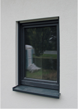 Am unteren Ende der Außenblende befindet sich ein weiß einbrennlackiertes Aluminiumprofil mit einer Tropfnase.