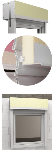 Der Aufsatzrollladenkasten ist mit einer Außenblende versehen. An der unteren Aluminiumabschlussschiene befindet sich ein Dichtungsprofil, welches den Panzerauslassschlitz verringert und damit die Zugluft im Rollraum verringert.