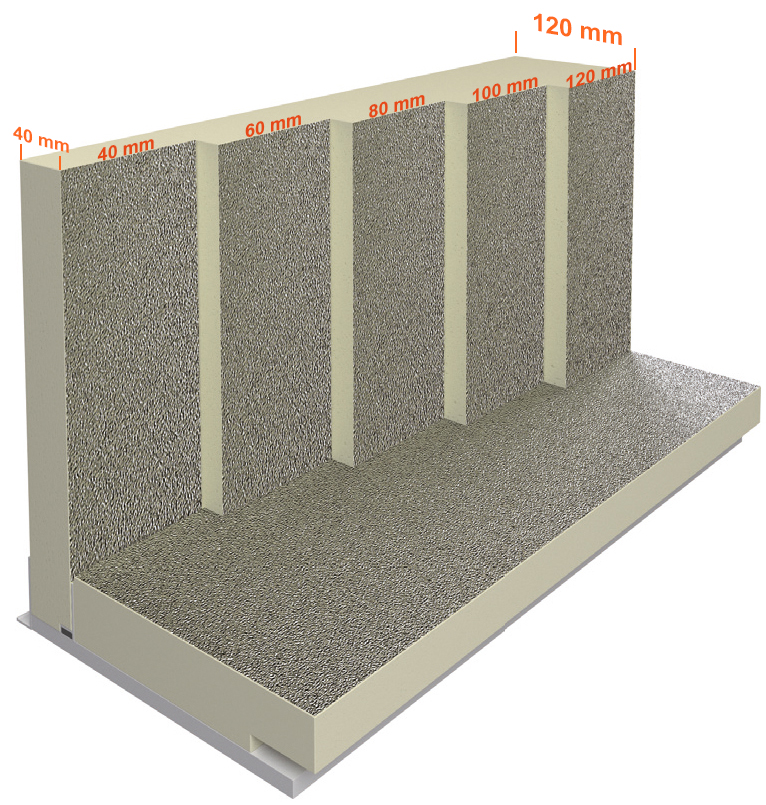 Beim RK 30A können Frontplattenstärken von 40 mm, 60 mm, 80 mm, 100 mm und 120 mm (PUR) in der WLG 024 gewählt werden. Hier werden U-Werte von 0,33 W/(m2K) und Psi-Werte von 0,10 W/(mK) erreicht.