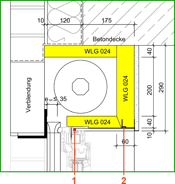 Für eine Kopfseitendämmung in der Materialstärke von 40 mm ist eine zusätzliche Aussparung von 60 mm erforderlich. Bei einer Dämmmaterialstärke von 20 mm reichen 40 mm.