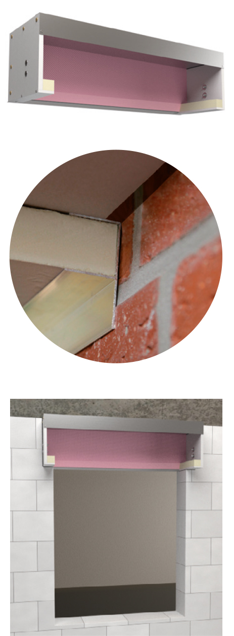 Der Fertigrollladenkasten hat an der Rückseite ein Aluminiumprofil als Anschlag für das Verblendmauerwerk.